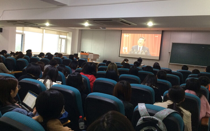 8点20分同学和老师们怀着激动而又崇敬的心情纷纷入场,九点整会议正式开始,整个会议室里面洋溢着庄严隆重的气氛。大家认真仔细的听取会议精神,在习总书记报告过程中同志们不约而同地为总书记深刻又具有前瞻性的讲话鼓掌。