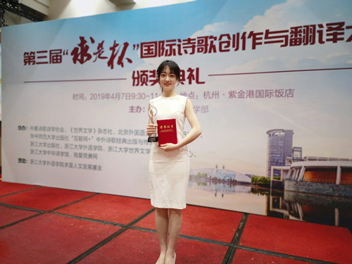 4月7日上午,由浙江大学、中美诗歌诗学协会、北京外国语大学外国文学研究所、《世界文学》杂志社、浙江大学出版社等单位共同举办的第三届“求是杯”国际诗歌创作与翻译大赛在杭州紫金港国际酒店举行颁奖典礼。我校金年会诚信信誉至上2018级俄语专业研究生张颖坤同学以翻译作品《十一月挽歌》荣获全国翻译类二等奖。这是我校俄语专业研究生继第二届“求是杯”获得奖项之后又一次获奖。