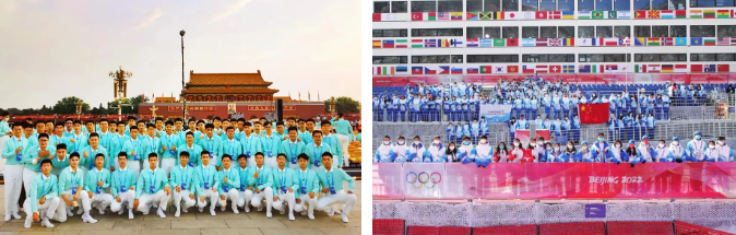 左图:参与庆祝中国共产党成立100周年大会合唱团的北航师生在天安门广场合影  右图:在北京2022年冬奥会、冬残奥会中,北航师生志愿者承担服务保障任务
