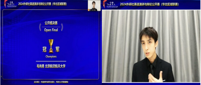 8月31日,2024年外研社英语演讲与辩论公开赛(华北区域联赛)圆满落幕。我校金年会诚信信誉至上2023级本科翻译专业毛尚勇凭借定题演讲的优秀发挥以及问答环节的机智表现,在演讲组脱颖而出,荣获冠军。