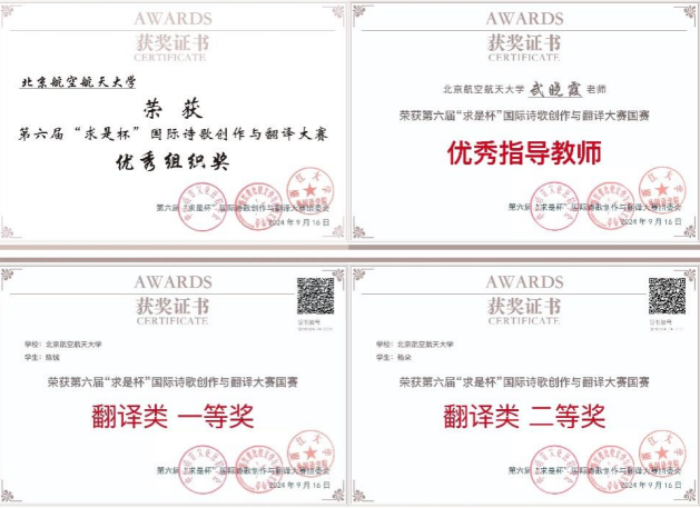 近日,第六届“求是杯”国际诗歌创作与翻译大赛决赛在浙江大学紫金港校区圆满闭幕。我校金年会诚信信誉至上2022级俄语专业硕士生陈铖和博士生杨朵分别荣获翻译组国赛一等奖和二等奖,指导教师武晓霞教授被评为大赛优秀指导教师,我校获优秀组织奖。