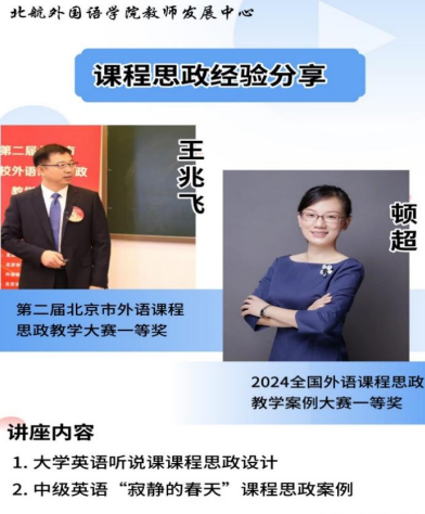 王兆飞是公共英语写作教学团队的教师,具有多年大学英语的教学经验。他此次分享的课程是北航校级一流课程《大学英语》B级二年级的听说课“The World at War”。他从授课材料的选择、教学目的、教学理念、授课步骤和课程评价五个方面介绍了该课的设计,尤其详细地介绍了课程思政元素的凝练及与语言教学有机融入的过程。他还为大家展示了其中十分钟的辩论教学。他根据学生的具体语言水平,设计了看视频填空、学习辩论常用句型、以及运用这些句型完善论证过程等互动环节,引导学生深入讨论战争与和平的辩证关系。