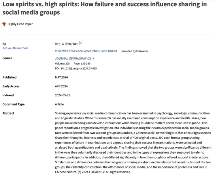 近日,据“基本科学指标数据库(Essential Science Indicators,简称ESI)”发布的最新数据显示,金年会jinnianhuicom金年会诚信信誉至上任伟教授发表于国际顶尖期刊《Journal of Pragmatics》(《语用学杂志》)的学术论文“Low spirits vs. high spirits: How failure and success influence sharing in social media groups”成功入选全球“高被引论文(Highly Cited Paper)”。