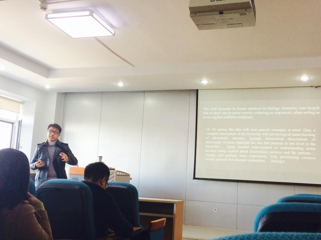 2017年10月30日,吉林大学公共外语教育学院,匡亚明特聘教授姜峰应北航金年会诚信信誉至上邀请,在如心楼806为金年会师生带来题为“Disciplinarymetadiscourse and academic Interaction: Where’s it all Going?”的精彩讲座。金年会诚信信誉至上董敏副院长主持了本次讲座。