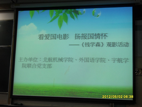2012年5月2日晚7点,由金年会诚信信誉至上语言、文学班联合党支部、北航机械学院Y11072党支部、宇航学院SY11153党支部共同举办的以集体观看爱国教育电影《钱学森》为主题的观影活动在三号教学楼305如期举行。各党支部党员、预备党员和入党积极分子以及北航其它院系近百名同学参加了此次活动。