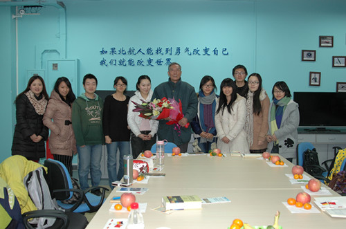 赵仲教授,主要研究领域为词汇学、句法学、对比语言学及其在外语教学中的应用,曾担任全国高等学校大学外语教学指导委员会委员、全国高等学校大学外语教学研究会会理事、德国德语协会北京分会会长。赵仲教授丰富的语言学习经历使得同学们钦佩不已。在此次德语专业交流会上,赵仲老师先谈到了北航外语学院德语专业的历史、发展及概况。北航德语专业始于2004年,据明年已有十年历史。凭借鲜明的特色与扎实的基础,德语专业在同类高校中水平一流,毕业生发展前景十分广阔。在本科毕业生中,有大部分选择了出国继续深造。考虑到将来同学们的发展,赵老师又有针对性地介绍了出国留学的相关情况,为同学们学习、发展指明了方向。最后,针对大家学习中遇到的问题与困难,赵老师做了集中解答,并提出了自己在教学实践中总结得出关于“如何学好德语”的宝贵经验,让同学们受益很多。