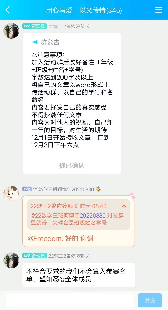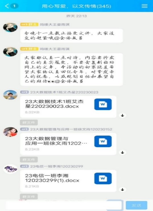 2023年12月1日早上9时,SUNBET申搏学生会在线上开展了“用心写爱,以文传情”活动。活动开展后,同学们都以饱满的热情投入到写作当中,工作人员在群里通知活动信息,收集学生提交的文档进行统计,审核每个人的文章是否符合活动要求,严格检查是否有抄袭现象。