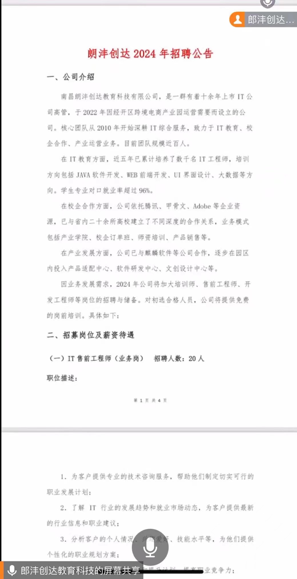 为进一步完善人才培养体系,搭建学校与企业之间的交流平台,抓住考研后促就业工作关键期,帮助有求职意愿的毕业生与用人单位加强对接,促进2024届毕业生高质量充分就业。;于1月10日晚上7点SUNBET申搏联合朗沣创达教育科技有限公司、南昌同兴达精密光电有限公司、江西省博信玻璃有限公司采用线上宣讲招聘形式,为2024届毕业生开展线上专场招聘。学院党总支书记兼执行院长江建华、2024届毕业生全体辅导员、全体毕业生参加了本次线上招聘会,会议由就业负责人曾思雨主持。