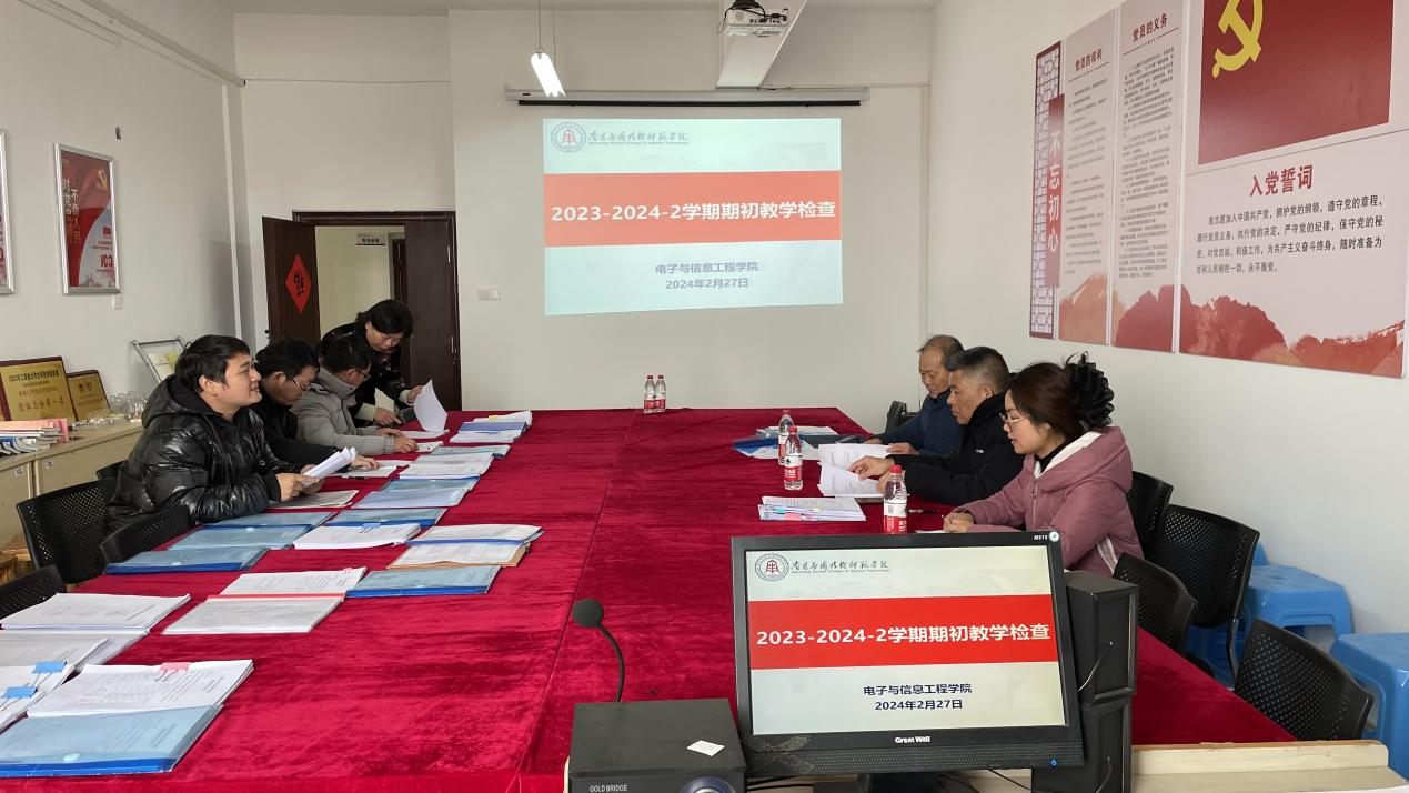 检查开始前,学院党总支书记、执行院长江建华代表学院对学校检查组的到来表示热烈欢迎,并对期初学院教学检查自查情况进行简要汇报。随后,检查组组长、教学督导办主任戴金波对此次检查目的、意义进行了说明,强调了检查过程中应注意关注的重点。检查过程中,校教学检查组认真负责,严格把关,对教师教学任务书、课表、教学大纲、教学日历、教案、教学课件、教研室活动计划等材料进行了认真、仔细的检查,对存在的问题进行了详细记录并进行了及时反馈。