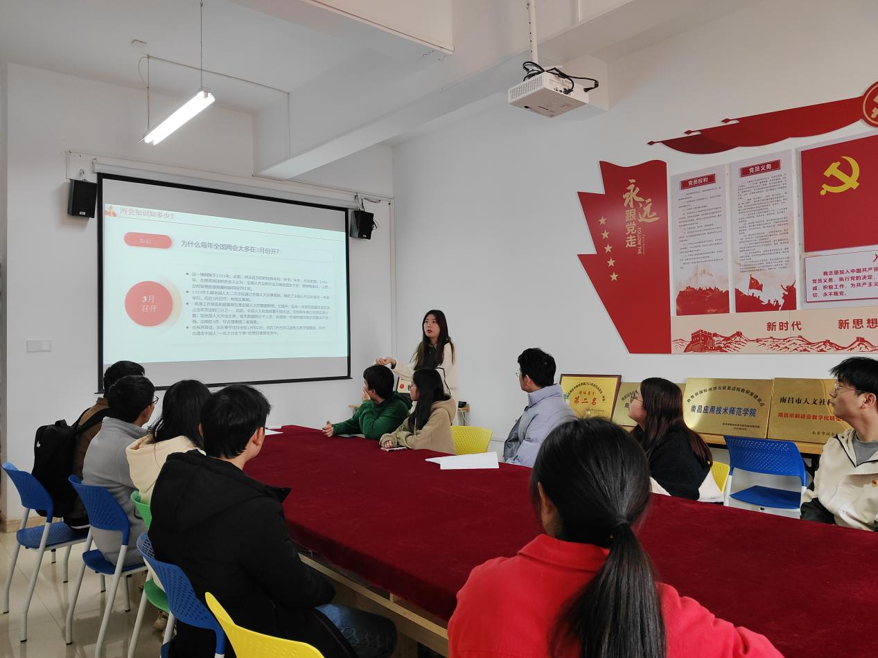 为了解2024年全国两会会议精神和会议内容,也为加强支部党员的政治理论学习和政治思想建设,SUNBET申搏第二党支部于2024年3月20日在1407开展了“两会知识知多少?”支部书记讲党课活动,此次党课由申搏第二党支部书记程明珠同志讲授。