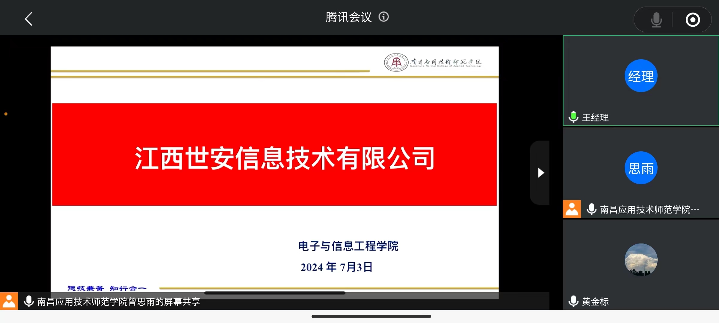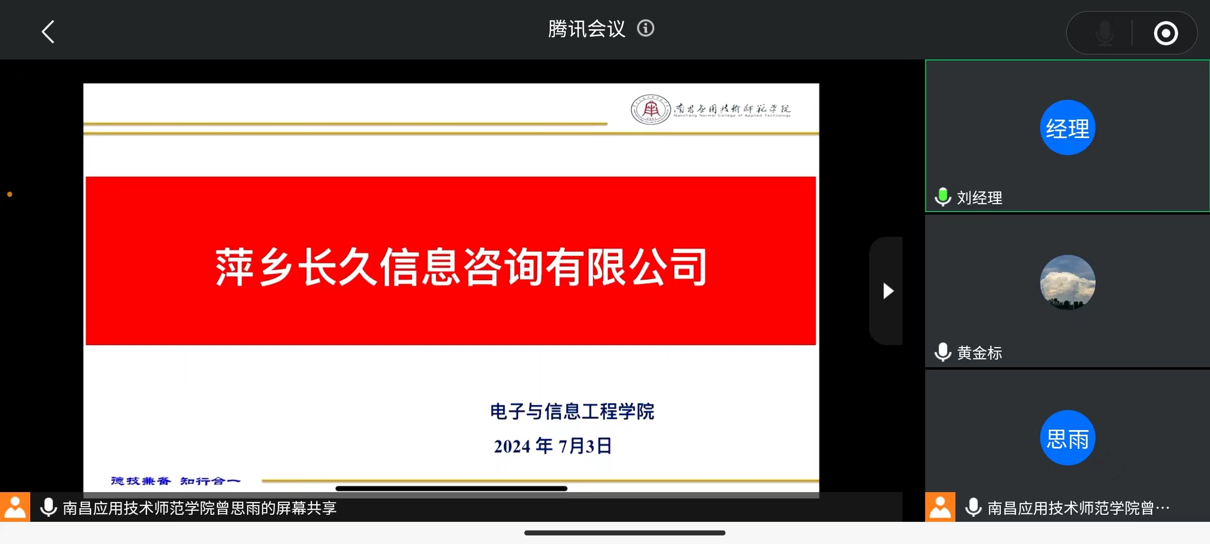 为开拓更多的就业岗位和机会,推动毕业生高质量充分就业。7月3日,申搏与萍乡长久信息咨询有限公司和江西世安信息技术有限公司开展线上访企拓岗校企合作交流会。电子与信息工程学院党总支副书记黄金标与就业专员曾思雨参加本次会议交流会。