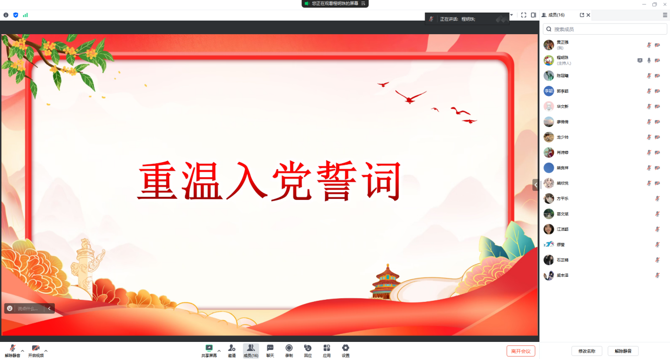 接着,宣传委员兼统战委员龙少帅带领大家重温入党誓词,坚定了党员同志的初心和使命。坚定共产主义信念,强化共产党员的责任感、使命感,增强支部的凝聚力与战斗力。