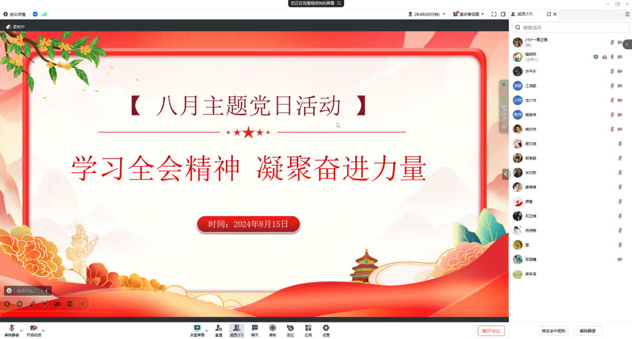 为深入学习贯彻党的二十届三中全会精神,感悟革命历史,强化爱国情怀和使命感,激励党员同志勇毅前行,争当先锋,SUNBET申搏第二党支部于8月15日召开线上会议,开展了“学习全会精神 凝聚奋进力量”主题党日活动。