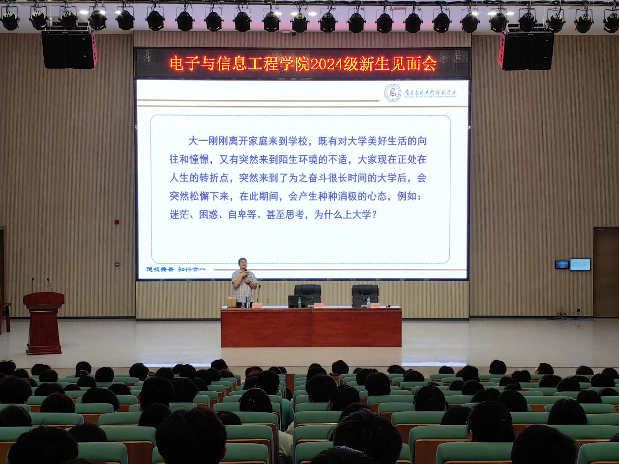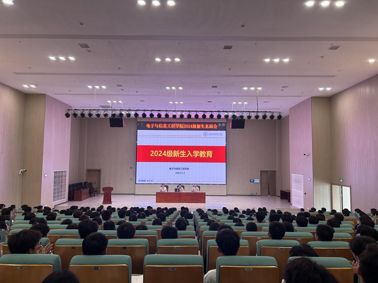 为引导新生快速适应校园生活,增强自我认知与责任感,遵守校规校纪,树牢校园安全意识,电子与信息工程学院于9月3日在图书馆报告厅召开2024级新生入学教育大会。院长魏艳平、党总支书记江建华出席本次大会,会议由党总支副书记黄金标主持,2024级全体新生参与会议。