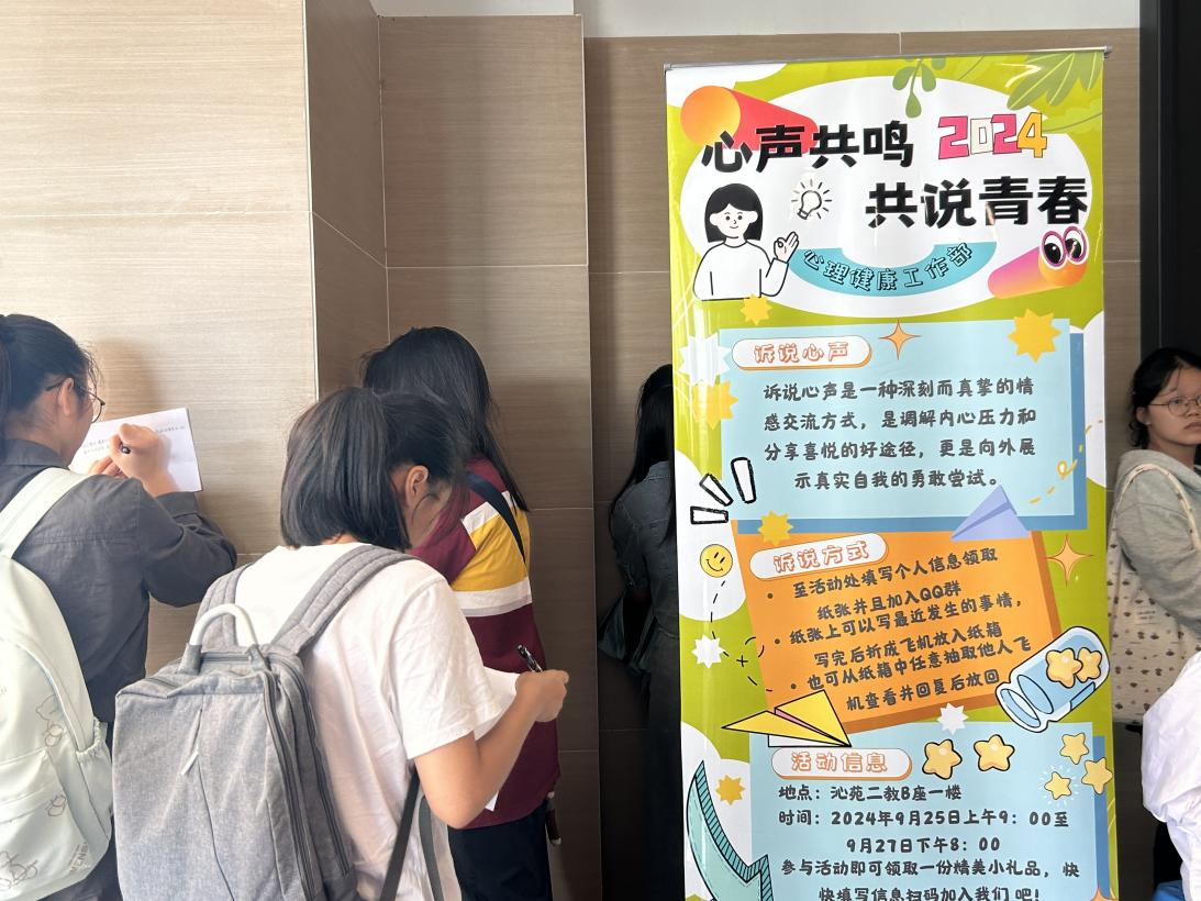 2024年9月25日至9月27日,由心理咨询中心主办、SUNBET申搏心理健康工作部承办的“心声共鸣,共说青春”心理健康主题活动在沁苑2教B座1楼圆满举办。此次活动旨在鼓励新生勇于诉说上大学以来的心路历程,传递温暖,营造积极向上的校园氛围。