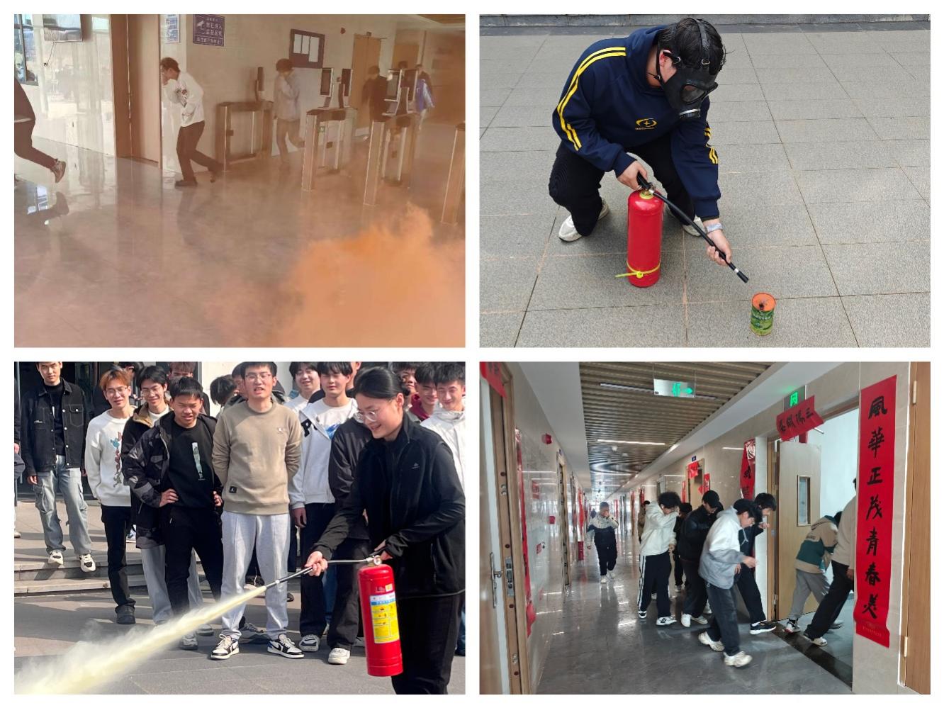 演练严格遵守理论讲解、疏散逃生与实战灭火三大环节推进。校保卫处负责人结合校园火灾案例,着重解析了日常火灾隐患的识别要点、应急疏散的黄金窗口期及不同场景下的逃生决策原则。随着浓烟弥漫、警报骤响,辅导员迅速组织班级同学弯腰捂鼻,沿预定路线有序撤离。疏散结束后,师生分组体验了干粉灭火器与消防水带操作,保卫处人员逐项纠正动作细节,确保“一提二拔三握四压”的规范流程落实到位。