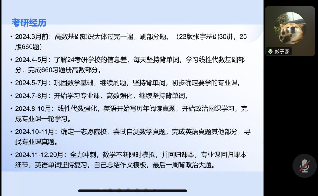 为帮助电信学子应对升学与就业挑战,增强职业规划能力,4月8日19时,考研上岸经验分享会在腾讯会议顺利举办。该活动邀请肖烨、彭子豪两位考研优秀学生代表以考研为主题进行经验分享,吸引了学院多名同学参与。