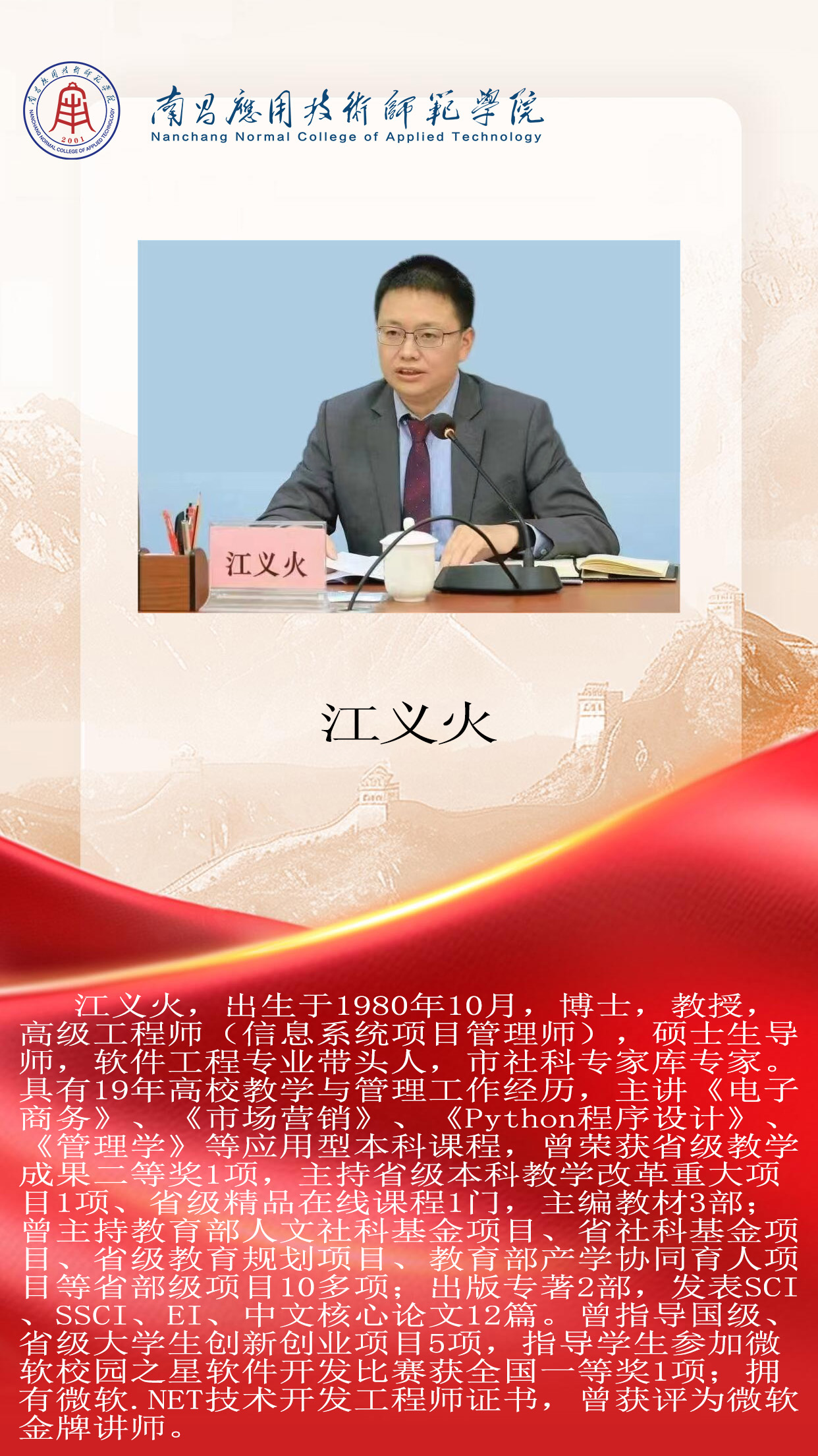 先进典型 优秀毕业生 优秀学生风采 优秀教职工 您现在的位置是:首页 > 先进典型 > 优秀教职工 江义火 博士 管理员2025-06-161280 上一篇 韩文玉 优秀教师 下一篇 张扬 工程技术系主任