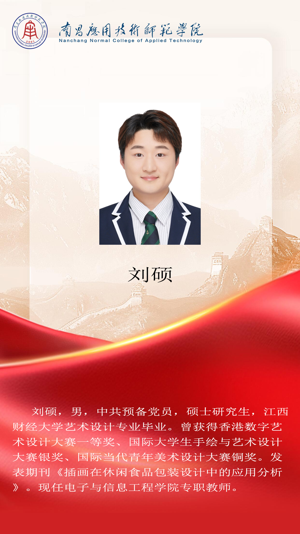 先进典型 优秀毕业生 优秀学生风采 优秀教职工 您现在的位置是:首页 > 先进典型 > 优秀教职工 刘硕 数字媒体系主任 管理员2025-06-161308 上一篇 刘军 副教授 下一篇 张扬 工程技术系主任