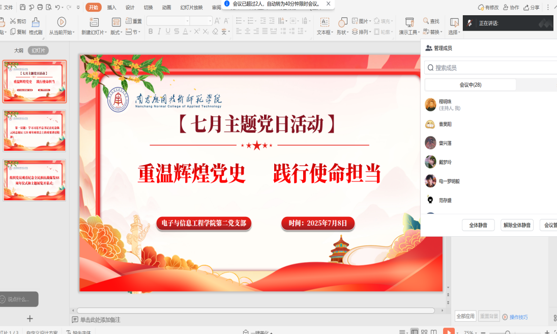 活动最后程明珠同志对本次活动进行总结,学生党员们应以此次学习为契机,铭记历史,把学习成果转化为实际行动,以更加饱满的热情和更加昂扬的斗志投入到学习中,为推动学校和国家高质量发展贡献自己的力量。同时呼吁党员同志课后自主观看《抵御宗教渗透和防范校园传教》警示教育片,铸牢中华民族共同体意识,确保和谐稳定。