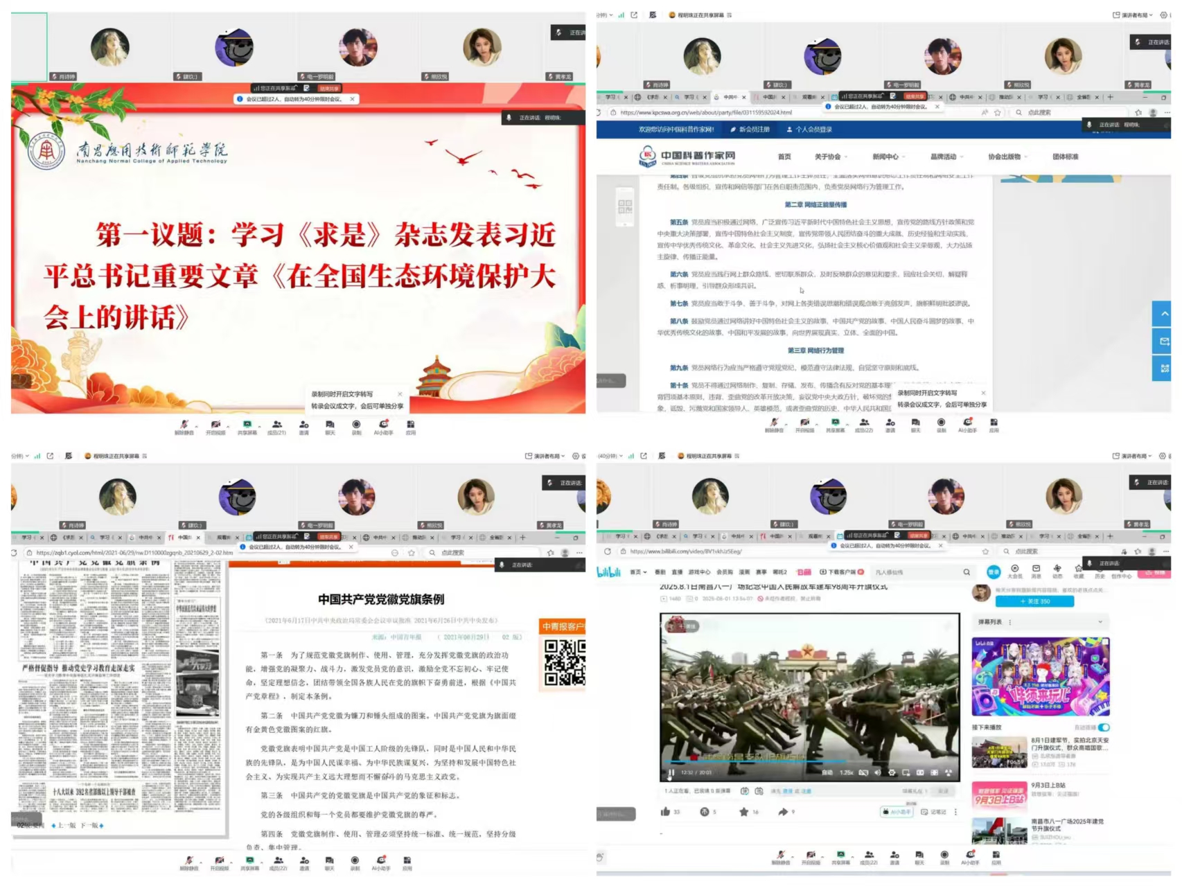 随后,组织大家学习了《党员网络行为正负面清单》和《中国共产党党徽党旗条例》,重温了《习近平总书记关于加强和改进民族工作的重要思想学习读本》第十章的原文内容,同时集体观看南昌八一广场“八一”升旗仪式视频回放。结束后大家纷纷表示要将生态文明理念融入到日常学习与生活中,并会以实际行动规范自身网络言行,同时深刻领会到党徽党旗所承载的神圣意义与象征价值,认识到正确使用和维护党徽党旗是每一位党员的责任与义务。
