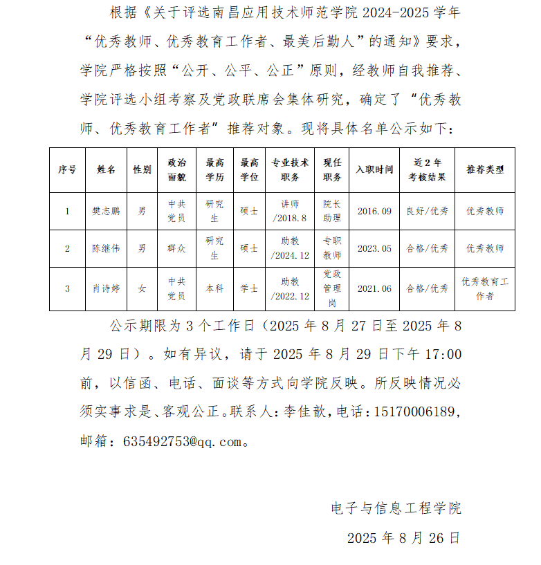 首页栏目 学院新闻 学院公告 学生工作 您现在的位置是:首页 > 首页栏目 > 学院公告 关于 2024-2025 学年“优秀教师、优秀教育工作者、最美后勤人“推荐对象的公示 管理员2025-08-261810 上一篇 关于公开招募SUNBET申搏SUNBET申搏2025年迎新志愿者的通知 下一篇 电信学院关于评选2025-2026学年第一学期“优秀学生干部”、“优秀工作者”、“文明寝室”、“先进班集体”获奖名单公示