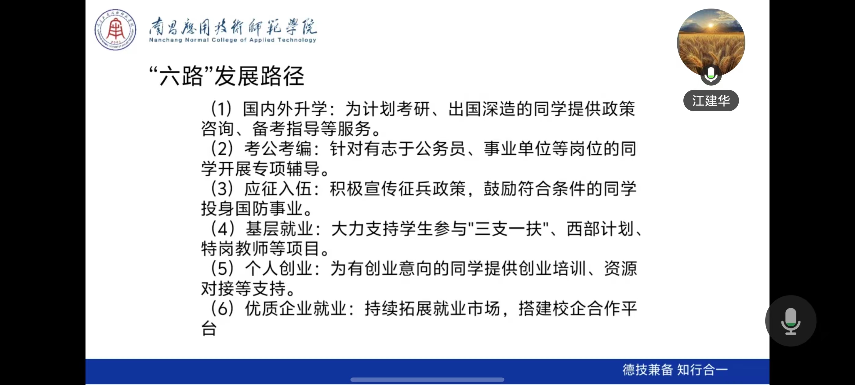 会上,党总支书记江建华首先介绍了近年来在协同育人方面的实践成果,重点阐述了“学校主导、家庭配合、社会赋能”的协同育人理念,引导家长转变教育观念,从“过度关注”转向“科学支持”,主动参与到学子成长过程中,携手共建全方位、立体化的育人环境。针对家长们普遍关心的学子升学、就业方向等核心问题,详细解读了学校打造的“六路发展路径”,为不同特长、不同志向的学子精准导航。具体而言,国内外升学路径聚焦学子深造需求,搭建考研、专升本绿色通道,同时拓展国际交流合作,为出国学子提供全方位支持;考公考编路径开设专项指导,助力学子实现公职服务理想;应征入伍路径强化国防教育,鼓励学子投身军营、锤炼意志;基层就业路径响应国家号召,引导学子扎根一线、奉献青春;个人创业路径搭建孵化平台,激发学子创新创业活力;优质企业就业路径深化校企对接,实现在校学习与企业岗位无缝衔接,全方位为学子铺就多元成才路。参会家长们纷纷留言表示,此次线上家长会内容充实、针对性强,不仅深入了解了学院的育人举措和“六路发展路径”,更明晰了家校协同的重要意义,今后将积极配合学院工作,做好学子的成长后盾。
