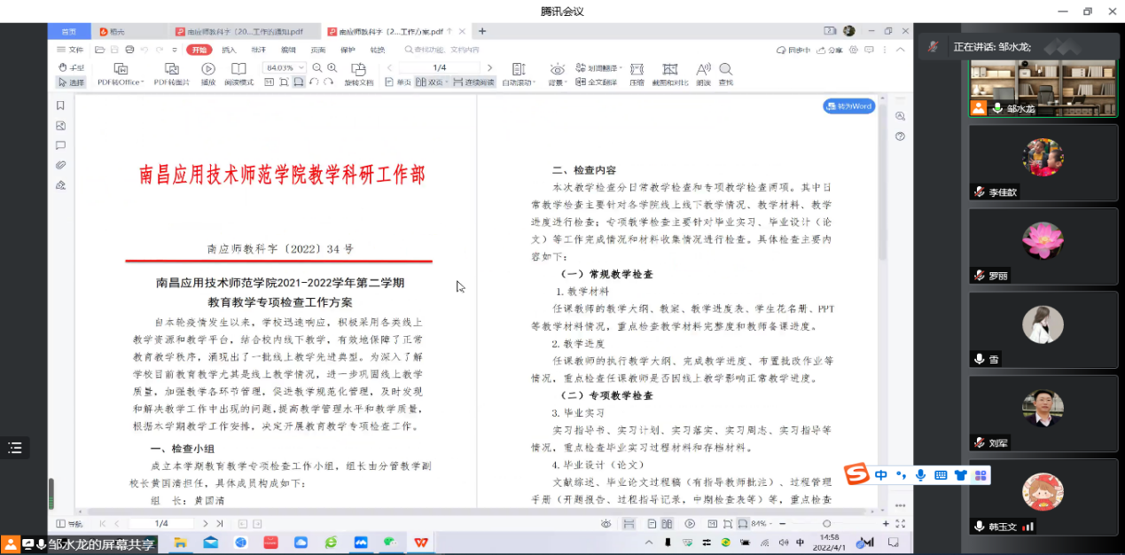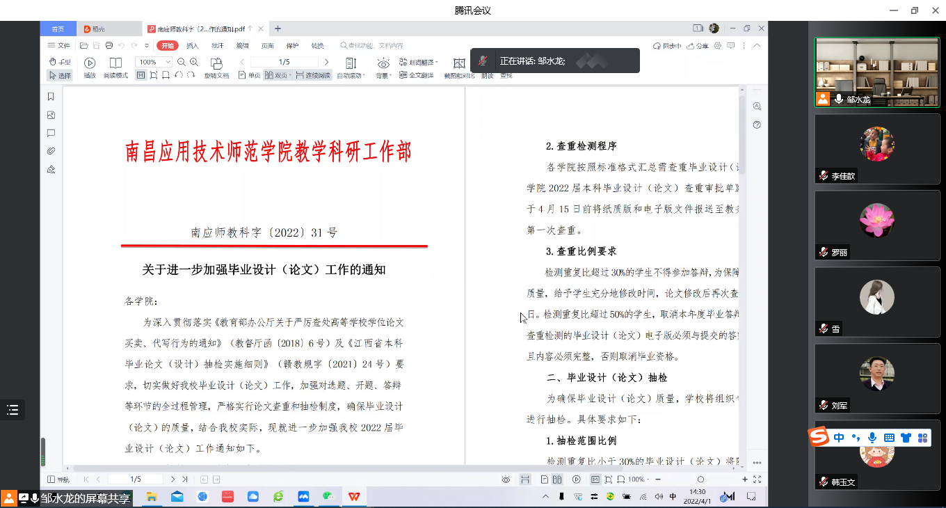 会上,邹水龙全文宣读了“关于进一步加强毕业设计(论文)工作的通知”(南应师教科字[2021]31号)、“SUNBET申搏2021-2022学年第二学期教育教学专项检查工作方案”(南应师教科字〔2022〕34 号)等文件,对毕业设计(论文)各个环节的工作进行了重点解读,邹水龙强调,毕业设计(论文)是人才培养重要环节,各教研室主任要提高认识,严格按照教育部、教育厅和学校相关文件要求,加强过程管理,加强督促,确保毕业生毕业设计(论文)质量。随后,与会老师围绕毕业设计(论文)指导、查重、答辩以及教育教学检查等方面工作进行了详细讨论。