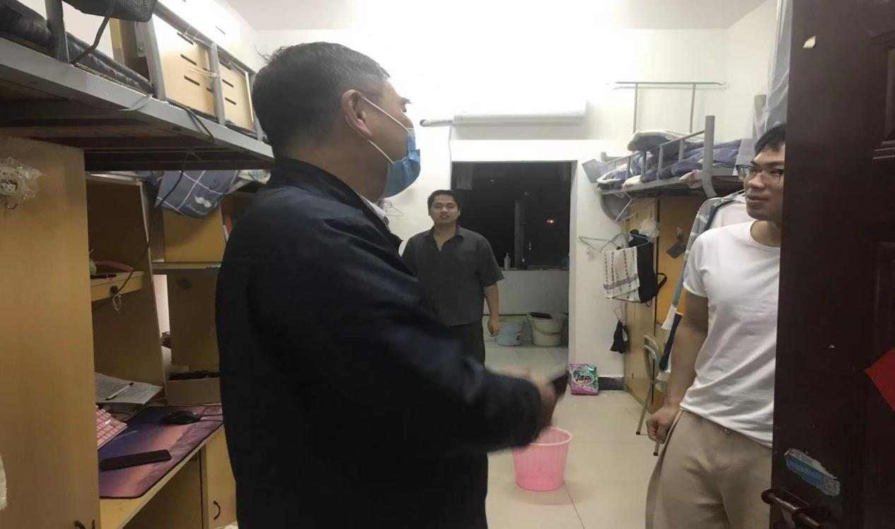 关怀入寝室,温情暖人心。为贯彻学校疫情防控要求,切实了解学生在疫情封闭期间的生活与学习情况,4月20日晚18点30分至19点20分,校领导郭宇带领学工处处长周林旺、副处长洪明、校团委副书记叶超、电子与信息工程学院党总支书记龙犇、学工处相关负责人以及申搏各班辅导员深入学生寝室,走访慰问学生。