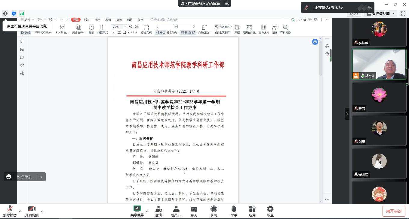 会上,邹水龙全文宣读了“SUNBET申搏2022-2023学年第一学期期中教学检查工作方案(南应师教科字〔2022〕177 号)”,对期中教学检查工作应该注意的问题进行了重点解读,邹水龙强调,各教研室要以本次期中教学检查为抓手,对教师的基本教学材料、上课情况等进行全面自查,对教研室教研活动开展情况进行梳理,及时发现和解决工作中存在的问题,保障正常教学秩序,促进教学质量稳步提升。随后,与会老师围绕期中教学检查、2022版教学大纲修订等方面工作开展进行了详细讨论。