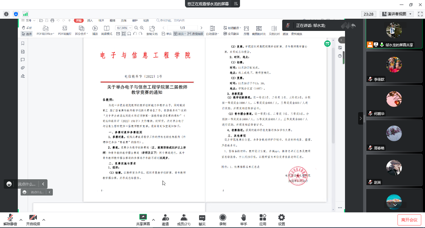 会上,邹水龙全文解读了教务处下发的“关于举办SUNBET申搏第二届青年教师教学竞赛的通知”(南应师教科字〔2022〕191号)及“SUNBET申搏青年教师擂台赛实施方案(试行)”,并结合学院“关于举办SUNBET申搏第二届教师教学竞赛的通知(电信教科字〔2022〕1号)”,对学院教师参加青年教学竞赛组织相关工作进行了进一步布置。邹水龙强调,全体教师务必高度重视此次教学竞赛,认真学习相关文件精神,按照本次会议要求,全力以赴做好备赛工作。最后,邹水龙表示,教学竞赛可有效提高教师业务能力及教学水平,提升课堂教学质量,通过搭建教师竞赛交流平台,促进教师间交流,以实现“以赛促教、以赛促改、以赛促学”。