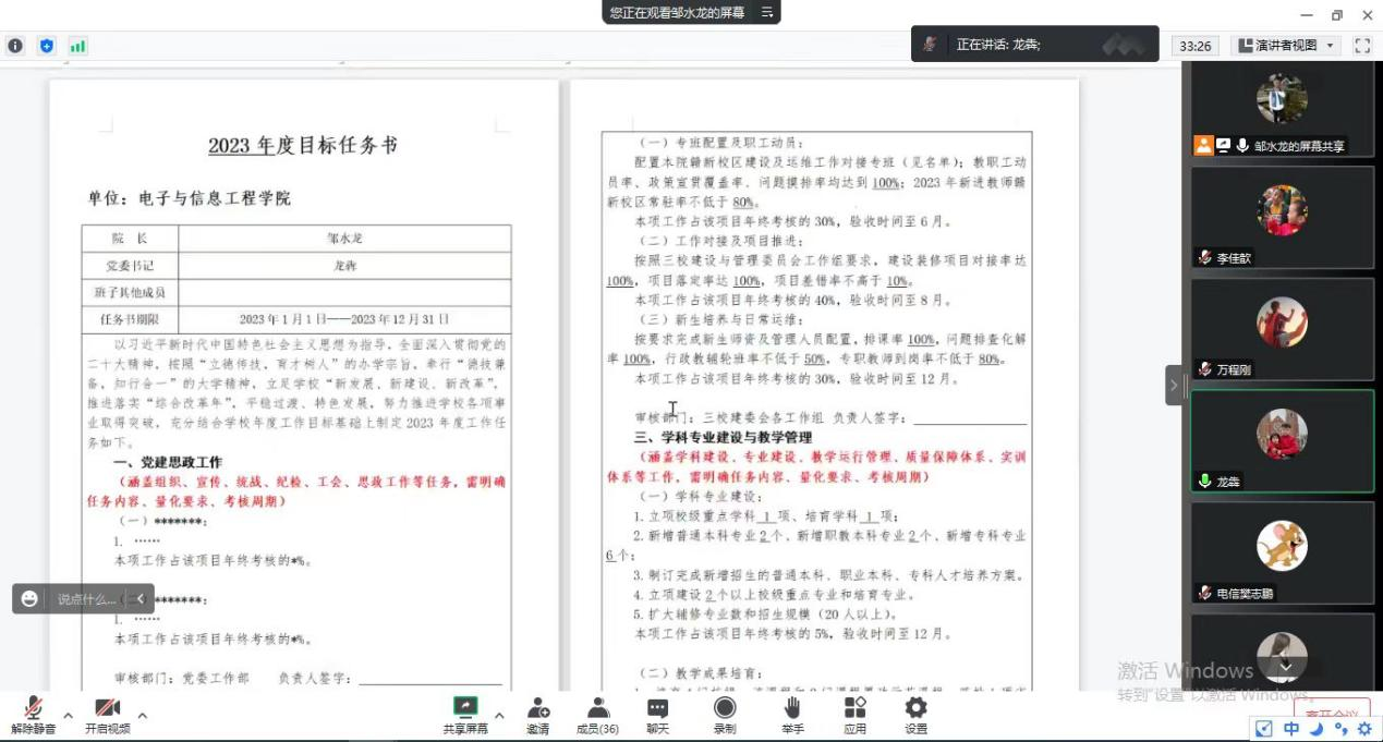 会上,邹水龙全文宣读人力资源部下发的《关于制订2023年度全员岗位目标任务书的通知》(南应师人字〔2023〕1 号),传达了校领导指示要求,并对学院2023年度岗位目标任务书制订总体目标进行了详细解读。他强调,2023年是学校“十四五规划”和“综合改革”的关键之年,学院学生规模将有很大增长,学科专业建设、课程建设、人才培养方案修订、实验室建设、科研、师资队伍建设、新校区建设与运维等将全面、深入推进,面对“新发展、新建设、新改革”,全院教职工务必提高政治站位,在充分结合学院2023年度工作目标任务基础上,认真思考,科学制定好个人岗位目标任务书。